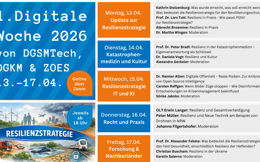 Vom 13. bis 17. April 2026 findet die 1. Digitale Woche von DGSMTech, DGKM und ZOES statt. Die Online-Veranstaltungsreihe widmet sich zentralen Fragen rund um die Resilienzstrategie und ihre Bedeutung für den Bevölkerungsschutz.