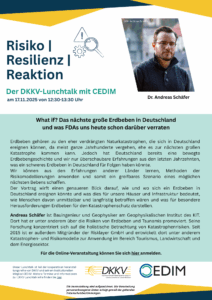Am Montag, den 17. November 2025, um 12:30 Uhr, findet die fünfte Session der gemeinsamen Lunchtalk-Reihe des DKKV und seines institutionellen Mitglieds CEDIM statt. Unter dem Titel „What if? Das Nächste große Erdbeben in Deutschland und was FDAs uns heute schon...