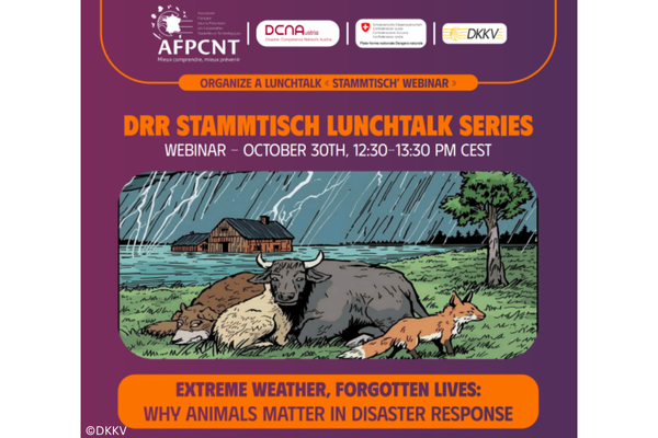 Am 30. Oktober 2025 von 12:30 bis 13:30 Uhr findet der Lunchtalk der DRR-Stammtisch-Serie statt. Das Webinar steht unter dem Thema Extreme Weather, Forgotten Lives: Why Animals Matter in Disaster Response.
