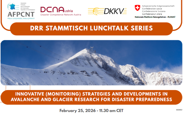 Am 25. Februar 2026 findet von 11:30 Uhr (MEZ) ein weiterer Lunchtalk der DRR Stammtisch Lunchtalk Series statt, der sich mit innovativen Monitoring-Strategien und aktuellen Entwicklungen in der Lawinen- und Gletscherforschung für die Katastrophenvorsorge befasst. Gastgeber der Online-Veranstaltung ist das Disaster Competence Network Austria (DCNA) in Zusammenarbeit mit der Nationalen Plattform Naturgefahren (PLANAT).