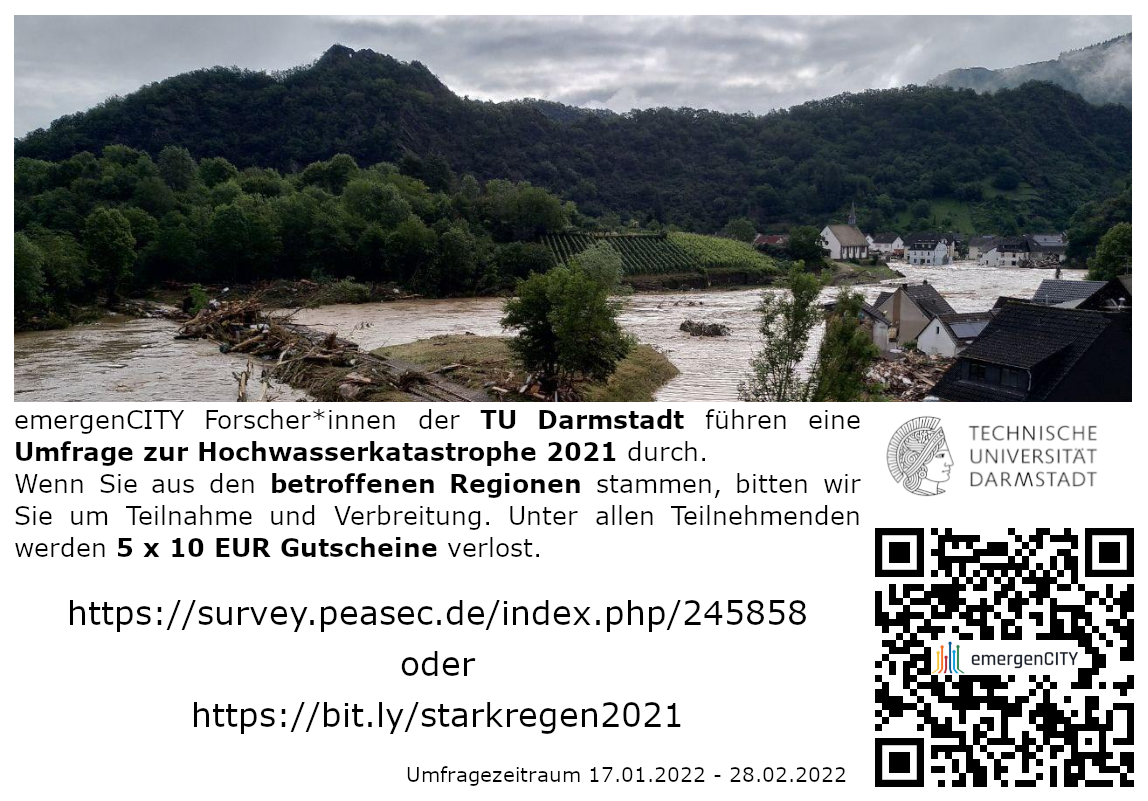 Im Rahmen des interdisziplinären Forschungsprojekts emergenCITY wird derzeit eine Online-Umfrage unter Bürger:innen in von der Flutkatastrophe betroffenen Regionen durchgeführt. Die Datenerhebung richtet sich an Einwohner:innen ausgewählter PLZ-Gebiete in Rheinland-Pfalz, Nordrhein-Westfalen, Bayern sowie weiteren betroffenen Bundesländern und findet im Zeitraum Januar bis Februar 2022 (ggf. verlängert) statt. Ziel der Befragung ist es, Erkenntnisse zu Selbstorganisation, Konnektivität, […]