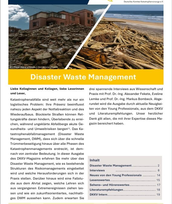 Katastrophenabfälle stellen weit mehr als ein logistisches Problem dar und beeinflussen nahezu alle Phasen der Notfallreaktion und des Wiederaufbaus. Die aktuelle Ausgabe widmet sich dem Thema Disaster Waste Management, beleuchtet dessen Einbettung in bestehende Risikomanagementstrukturen und zeigt anhand einer Fallstudie aus dem Ahrtal zentrale Herausforderungen und Lösungsansätze auf. Zudem erwarten Sie drei spannende Interviews mit Prof. Dr.-Ing. Alexander Fekete, Eveline Lemke und Prof. Dr.-Ing. Markus Bombeck.