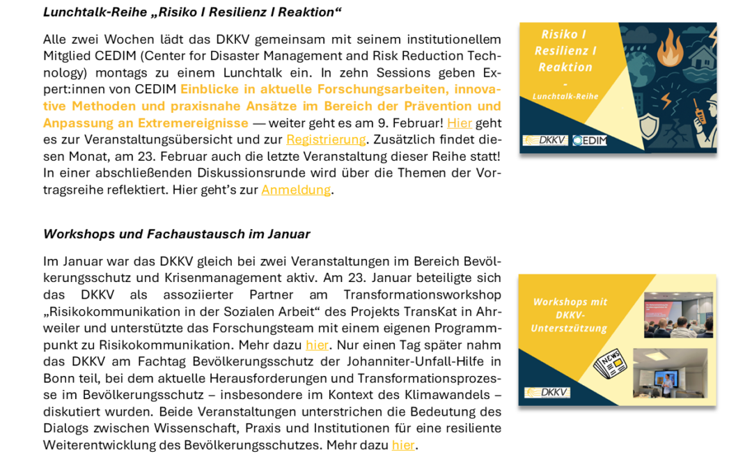 In diesem Newsletter erwarten Sie spannende Einblicke in unsere aktuellen Projekte und Aktivitäten sowie ausgewählte Neuigkeiten aus dem Bereich der Krisen- und Katastrophenvorsorge. Außerdem haben wir für Sie eine Übersicht bevorstehender Veranstaltungen und Informationen zu aktuellen Extremereignissen zusammengestellt.