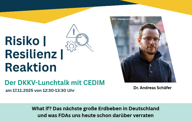 Am Montag, den 17.11. findet um 12:30 Uhr die fünfte der gemeinsamen Lunchtalk-Reihe des DKKV und seines institutionellen Mitglieds CEDIM statt. Unter dem Titel „What if? Das Nächste große Erdbeben in Deutschland und was FDAs uns heute schon darüber verraten“ wirft Dr. Schäfer einen genaueren Blick darauf, wie und wo sich ein Erdbeben in Deutschland ereignen könnte und was dies für unsere Häuser und Infrastruktur bedeutet, wie Menschen davon unmittelbar und langfristig betroffen wären und was für besondere Herausforderungen Erdbeben für den Katastrophenschutz darstellen.