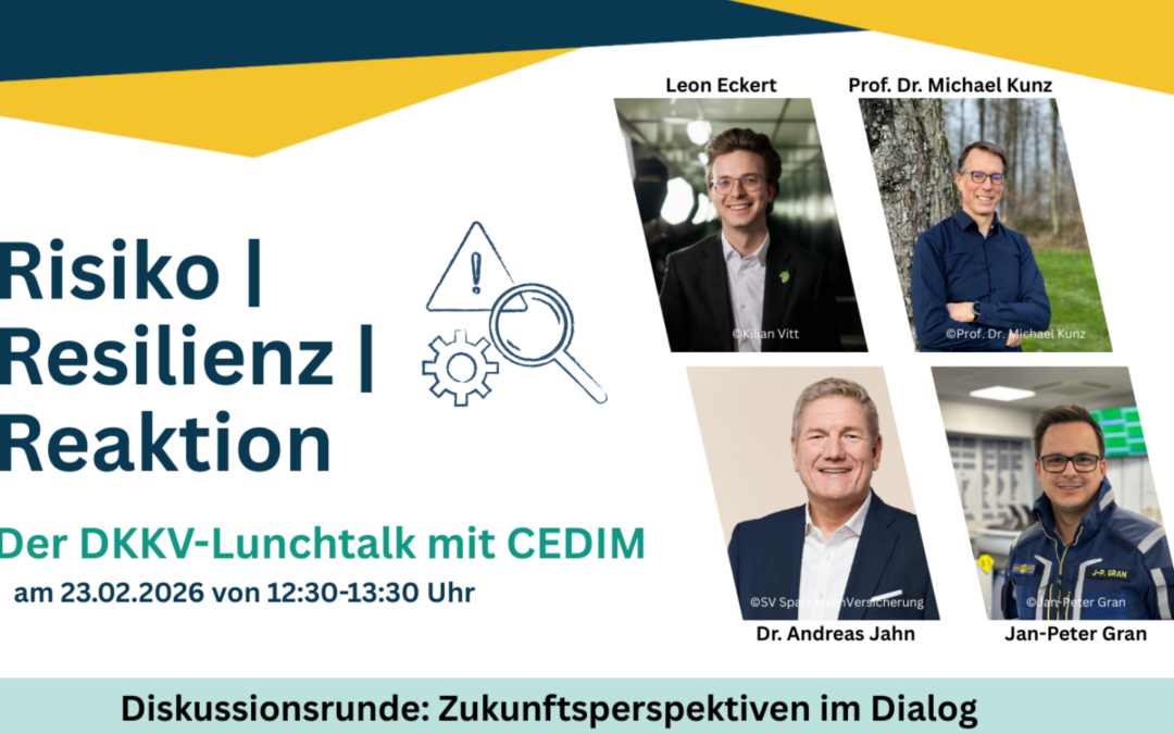 Am Montag, den 23. Februar 2026, von 12:30 bis 13:30 Uhr, findet die Abschlussveranstaltung der gemeinsamen Lunchtalk-Reihe des DKKV und seines institutionellen Mitglieds CEDIM unter dem Titel „Zukunftsperspektiven im Dialog“ statt. In dieser Diskussionsrunde begegnen sich vier Perspektiven – Politik, Wissenschaft, Versicherung und Katastrophenschutz – um die zentralen Themen der Reihe Risiko | Resilienz | Reaktion interdisziplinär zu reflektieren. Im Mittelpunkt steht die Frage, wie Staat, Forschung, Wirtschaft und Zivilgesellschaft ihre Kompetenzen bündeln können, um auf Extremereignisse resilient und wirkungsvoll zu reagieren.