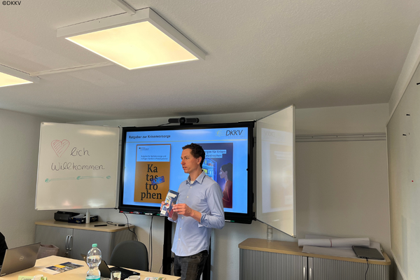 Das DKKV wurde durch seinen Geschäftsführer Dr. Benni Thiebes vertreten, der das Forschungsteam um Prof.in Dr.in habil. Caroline Schmitt (Frankfurt University of Applied Sciences), Johannes Eick (Frankfurt UAS) und Prof.in Dr.in Andrea Schmelz (Hochschule Coburg) mit einem eigenen Programmpunkt zum Thema Risikokommunikation unterstützte. Zum Einstieg wurde ein Serious Game eingesetzt, das als niedrigschwellige Auflockerung diente und zugleich erste Denkanstöße zum Umgang mit Risiken eröffnete. Daran anschließend folgte ein Vortrag, in dem unterschiedliche Aspekte, Herausforderungen und Beispiele der Risikokommunikation vorgestellt und eingeordnet wurden. Unterstützt wurde dieser Programmpunkt durch den Praktikanten Paul Hoffmeister.